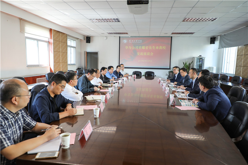 座谈会上,俞子泓代表学校对史耀宏一行来校考察交流表示欢迎,对华为技术有限公司一直以来为学校教育事业给予的关心、支持和帮助表示感谢,对华为科技创新引领的执著和奋斗精神表达了敬意。期间向来宾介绍了学校的历史沿革和办学历程,客观分析了当下学校发展的优势和困难,谈到在办好本科教育的同时,如何面向未来的方略,提出"工"字当先、工业为主、遵循"跟着工业干、围着企业转、质量求生存、转型促发展"的办学思路,进一步提出以新校区建设为契机,通过与华为合作共建"西北人工智能培训中心"等平台,打通引领兰州新区职教园区高职、应用型本科人才培养的"基地"建设通道,并就面向甘肃地方和"三圈四点"提供更为优质的毕业生表达了共同培养的合作愿景。黄荟铭就华为目前在学校软件学院的"点"和与学校战略合作的"面"的开展情况提出了华为助力我校新校区智慧校园建设的建设性建议;李贵山从计算机和通信学科建设方向,就专业建设、课程体系建设、人才培养、师资队伍建设、工程应用和信息化建设等六个方面提出了优化配置专业建设指导委员会委员构成、智能科学与技术和物联网工程两个专业的课程体系建设、学生进入华为相关企业实习、"一课两师"和"挂职进厂"实施措施、华为教育平台应用场景"校园"实践等具体诉求。