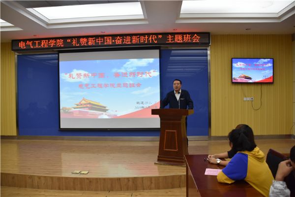 王华栋在班会上讲到,70年来,在中国共产党的坚强领导下,全国各族人民团结一心,迎难而上,开拓进取,奋力前行,从封闭落后迈向开放进步,从温饱不足迈向全面小康,从积贫积弱迈向繁荣富强,创造了一个又一个人类发展史上的伟大奇迹,中华民族迎来了从站起来、富起来到强起来的伟大飞跃。青年兴则国家兴,青年强则国家强,新时代需要一批有理想、有本领、有担当的青年学子。他希望青年学生要珍惜美好的大学时光,树立远大的奋斗目标,自觉把个人理想追求融入国家和民族的伟大事业之中。学校也会着眼于青年人生出彩,搭建“综合素养、专业素质、个性发展”平台,助力学生“成人、成长、成才”。