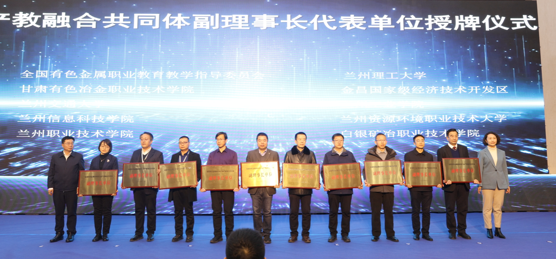 会上,与会领导共同为金昌国家级经开区有色金属新材料产教联合体暨全国有色金属新材料行业产教融合共同体揭牌,为各副理事长代表单位授牌,我校当选为副理事长单位。下一步,学校将依托全国有色金属新材料行业产教融合共同体,在材料类专业建设上更好利用全国有色金属新材料优势资源,不断提升人才培养质量,推进校企深度融合。