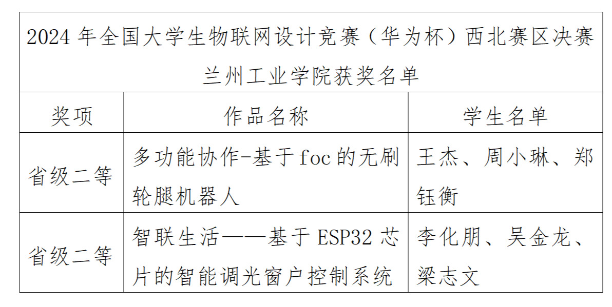 8月16日,由全国高等学校计算机教育研究会主办、华为技术有限公司协办的2024年全国大学生物联网设计竞赛(华为杯)西北赛区决赛在郑州大学落下帷幕。经过与多所高校参赛队伍的激烈比拼,通过答辩、作品现场演示和评审专家质询等竞赛环节,我校喜获二等奖2项。