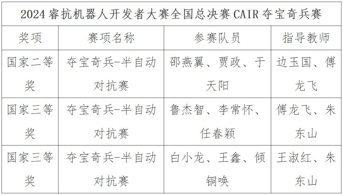 8月22日,由工业和信息化部人才交流中心主办,浙江大学机器人研究所、浙江大学创新创业研究院、浙江省机器人产业发展协会等单位协办的2024睿抗机器人开发者大赛全国总决赛在杭州圆满落幕。此次大赛汇聚了全国众多高校的精英团队,经过多轮激烈比拼,我校电气工程学院易创空间工作室的3支队伍凭借出色的表现脱颖而出,以西北赛区第一、第四、第六名的优异成绩闯入CAIR夺宝奇兵赛(半自动赛)全国总决赛,并最终荣获国家二等奖1项、三等奖2项。
