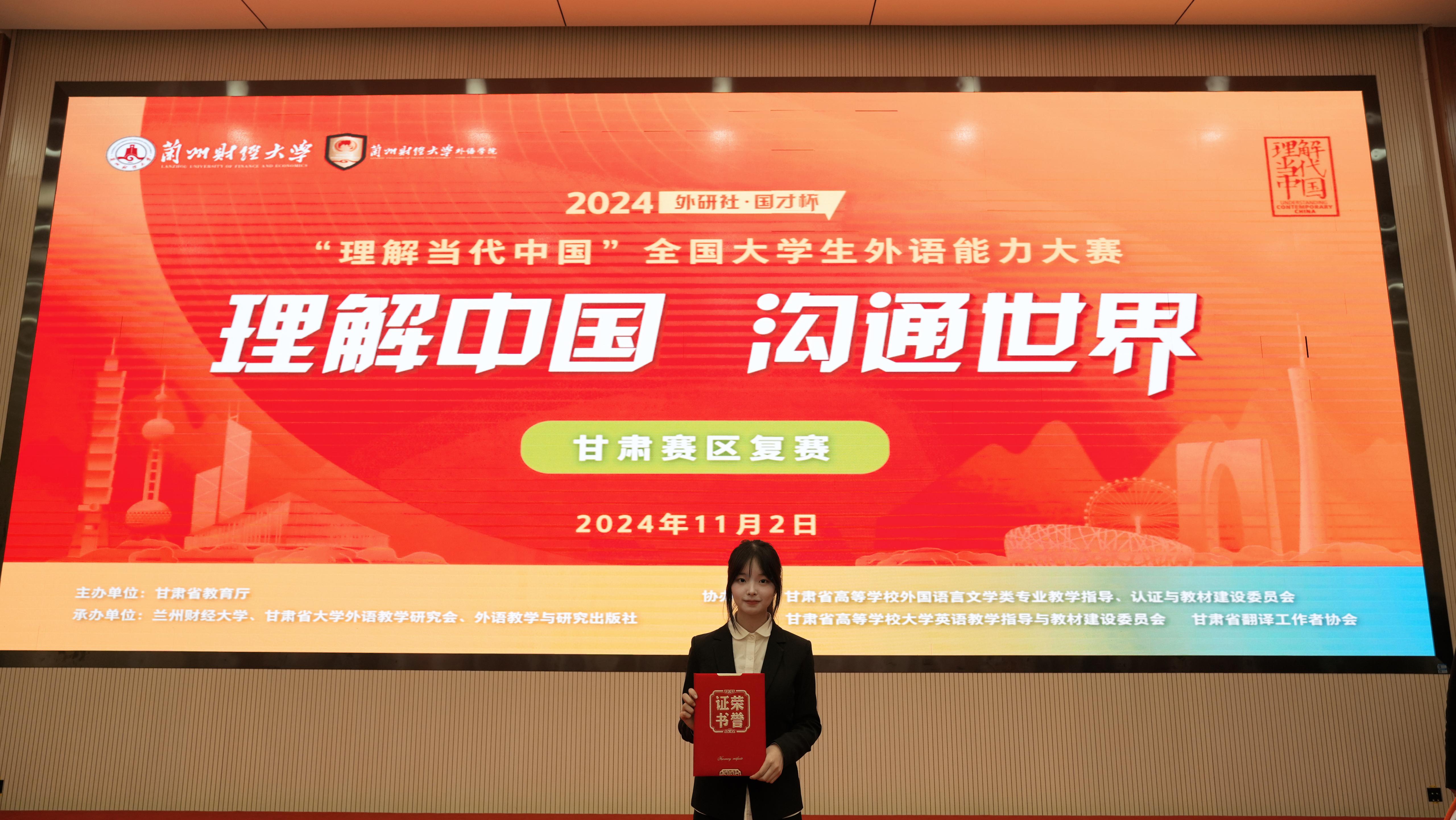 11月2日,2024“外研社•国才杯”“理解当代中国”全国大学生英语大赛省赛在兰州财经大学举办,来自甘肃省各高校的上百名选手参加了比赛。经过激烈角逐,我校电气23-2班林子渊(指导教师:张蓓蓓)荣获演讲组三等奖。