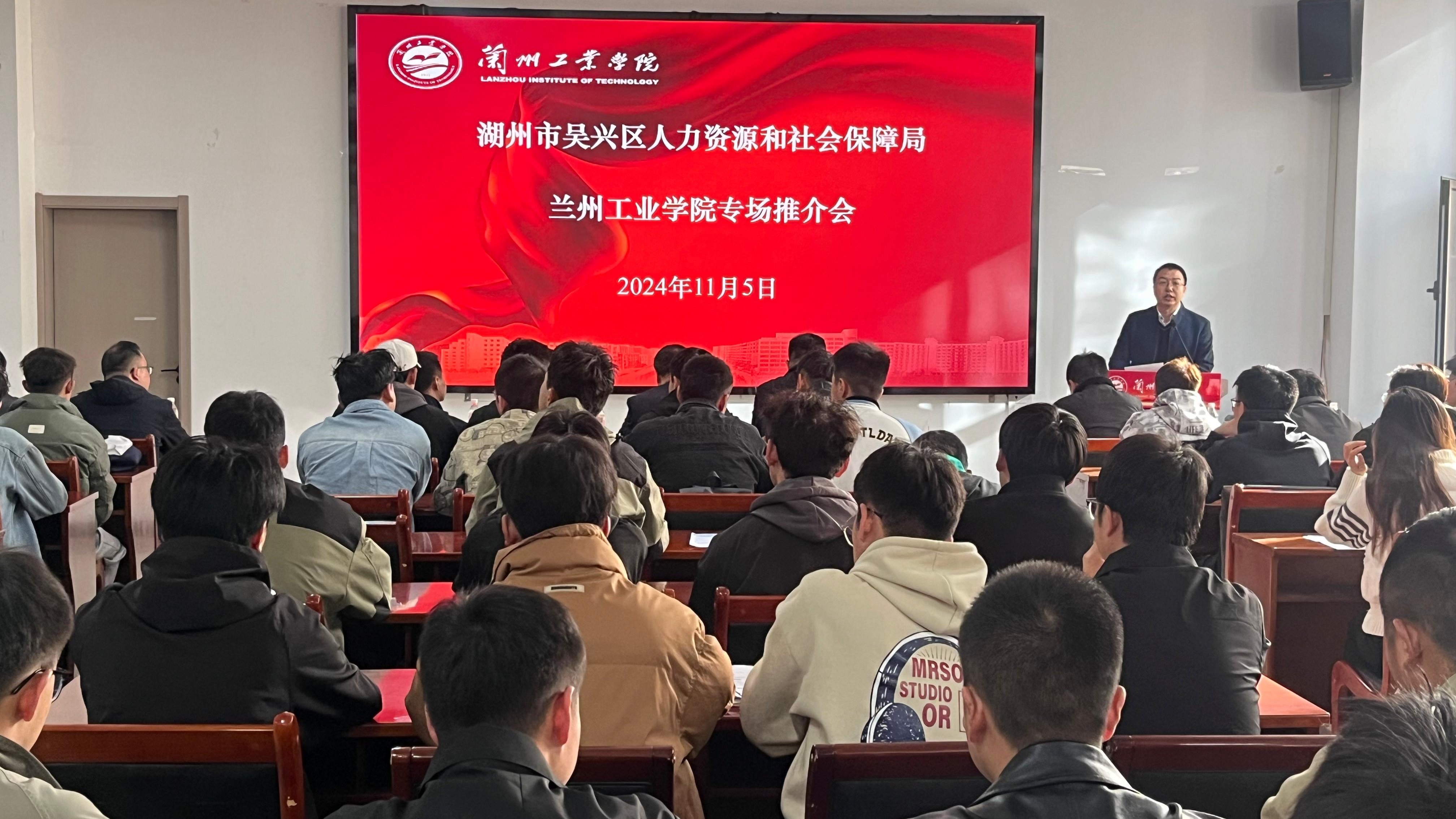 11月5日,学校与湖州市吴兴区人力资源和社会保障局在大学生活动中心多功能厅举办专场推介会。湖州市人力资源和社会保障局党组副书记、副局长胡培强,湖州市吴兴区人力资源和社会保障局党组成员、副局长胡亮,学校副校长马宏锋出席会议。