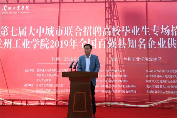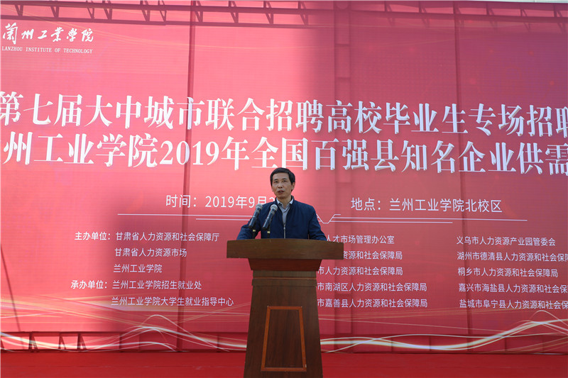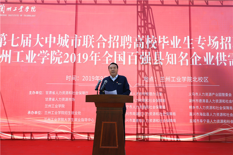 金秋九月,丹桂飘香,9月23日,在全国各族人民喜迎建国70周年之际,第七届大中城市联合招聘高校毕业生专场招聘会暨2019年全国百强县知名企业供需双选会在我校隆重举行。此次招聘会由甘肃省人力资源和社会保障厅和甘肃省人力资源市场主办,兰州工业学院承办。校长王华栋出席会议并讲话,校长助理雷在福主持开幕式。甘肃省人力资源市场副主任张志峰、办公室主任王喜银,浙江金华市、义乌市、慈溪市、湖州市德清县、嘉兴市南湖区、海宁市、桐乡市、嘉兴市海盐县、嘉兴市嘉善县、盐城市阜宁县等人社局相关领导参加双选会。