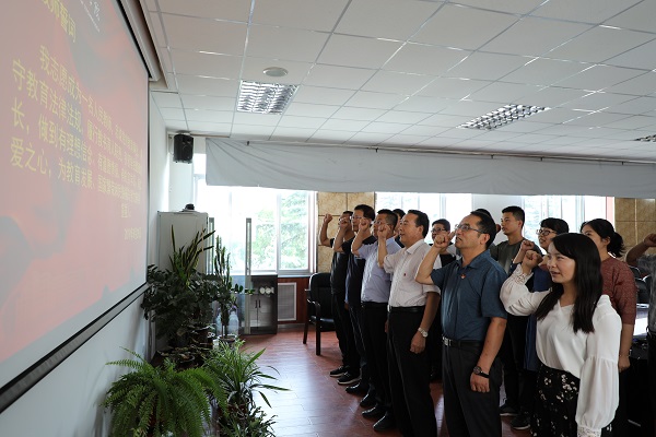 随后,按照省教育厅和学校有关文件精神,支部全体教职工进行了“立师德 铸师魂”师风师德建设宣誓活动,签定了2019年师德师风承诺书。