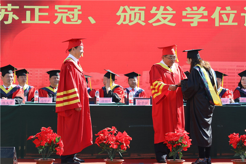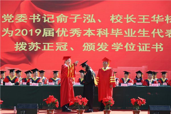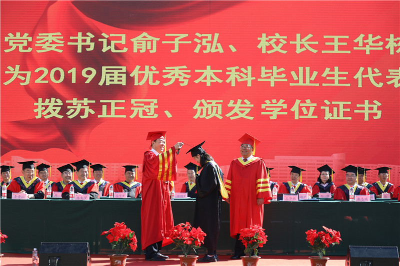 会后,各学院分别召开了2019届本科生毕业典礼暨学士学位授予仪式,各学位评定分委会成员依次为毕业生正冠拨苏、颁发学位证。