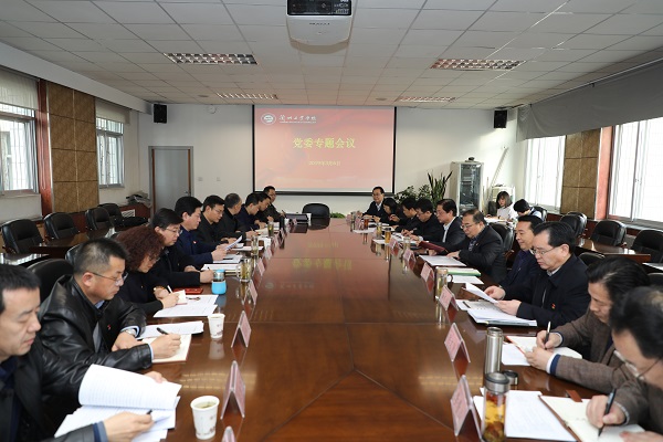 会议传达学习了全国、全省教育系统全面从严治党工作视频会议精神。会议认为,教育部党组书记、部长陈宝生在全国教育系统全面从严治党视频会议上的讲话,总结成绩全面系统,分析问题客观务实,任务部署重点突出,工作要求针对性强。陈宝生讲话指出,今年要重点抓好六个方面的工作:一是在强化创新理论武装上再聚焦再发力。二是在加强政治建设上再聚焦再发力。三是在锲而不舍抓作风建设上再聚焦再发力。四是在巩固发展反腐败斗争压倒性胜利成果上再聚焦再发力。五是在健全监督体系上再聚焦再发力。六是在提升基层党组织的组织力上再聚焦再发力。