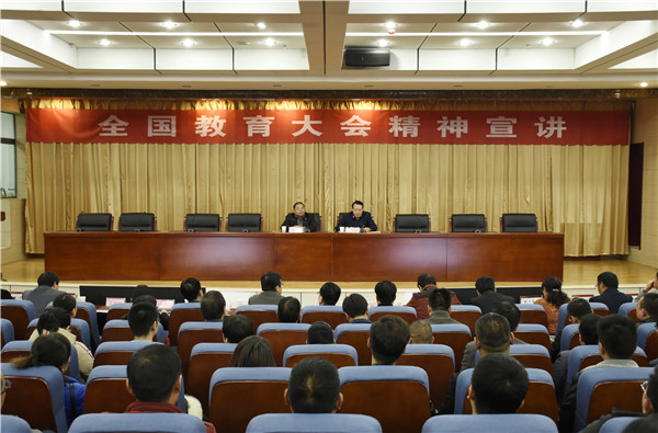 11月15日下午,党委书记俞子泓作为“甘肃教育百人宣讲团”成员之一,向全体教职工宣讲全国教育大会精神。校长王华栋主持宣讲会。纪委书记廉志端,副校长马江、陈文贤、马铁信、李贵山、郑小平,总会计师王多兴出席宣讲会。