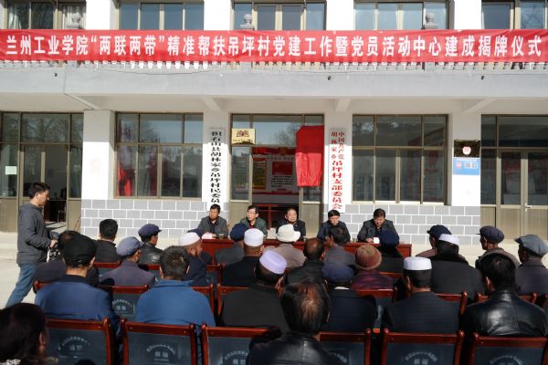 马江代表学校致辞。他指出,党员活动中心的建成,是两村党支部和党员政治生活中的一件大事,也是推进农村党支部标准化建设的重要内容,更是兰州工业学院党委提出“两联两带”精准帮扶两村党建工作的具体实践。学校党委创新性的提出建设“两联两带”精准帮扶左家村、吊坪村党建工作思路并制定具体的《实施方案》,就是要通过党建结对帮扶与脱贫攻坚深度融合,以解决左家村和吊坪村党建工作存在的问题为突破口,使党支部真正成为宣传党的政策、贯彻党的决定、推动改革发展、带领农民致富、维护农村稳定的坚强战斗堡垒,为如期完成脱贫目标和任务提供强有力的组织保证。