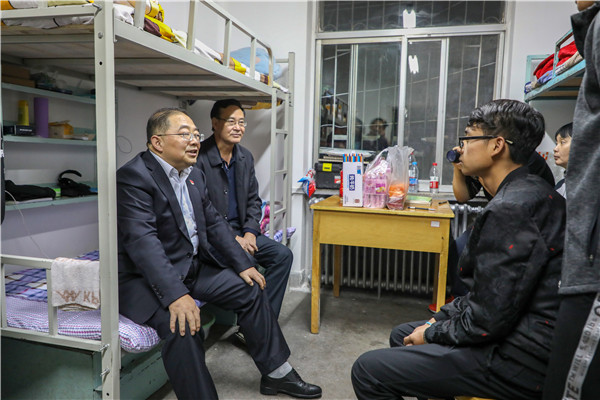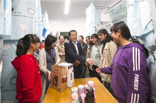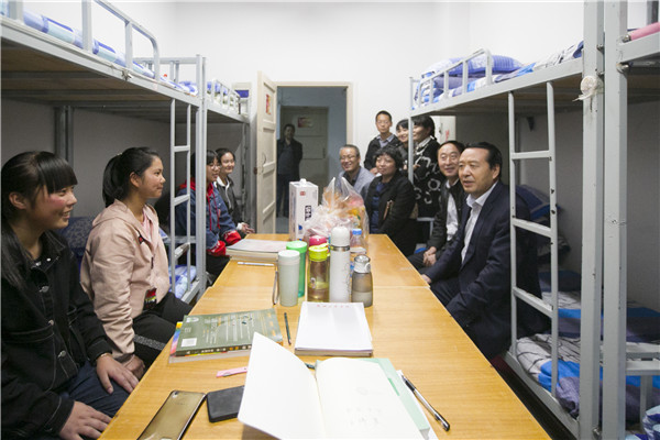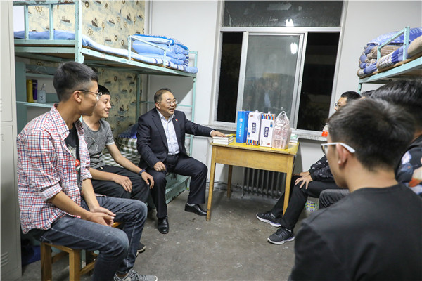 校领导来到学生公寓,来到同学们中间,送去对他们的节日祝福,并与大家亲切交谈,询问同学们学习生活等情况,希望同学们尽快转换角色,积极融入大学生活,在人生新阶段,树立新目标,实现新理想。同学们踊跃发言,畅谈入校十多天来的感受体会。宿舍里欢声笑语,洋溢着浓浓的师生情谊。