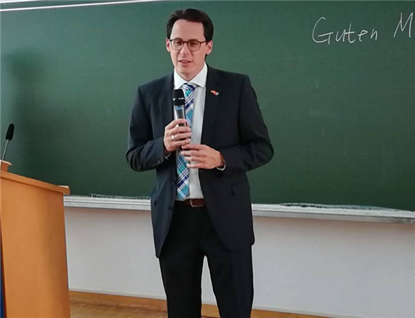 第一周学习期间,代根多夫市市长AndreasHohn和经济部部长GuntherPamme专程前来研修班,代表市政府对本次中国研修班的来访学习表示热烈欢迎,同时介绍了代根多夫市的总体概况,肯定了代根多夫应用技术大学对当地经济的影响以及学校在本市的重要地位。