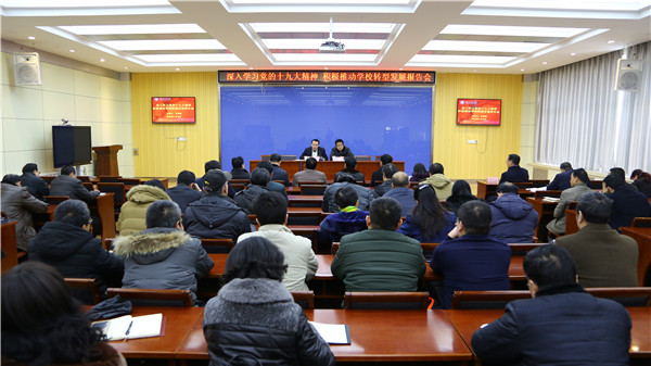 2018年1月10日下午,校长王华栋在第一学术报告厅作十九大精神专题辅导报告。全体校领导出席报告会,副校长魏军主持报告会,全体中层干部听取了报告。