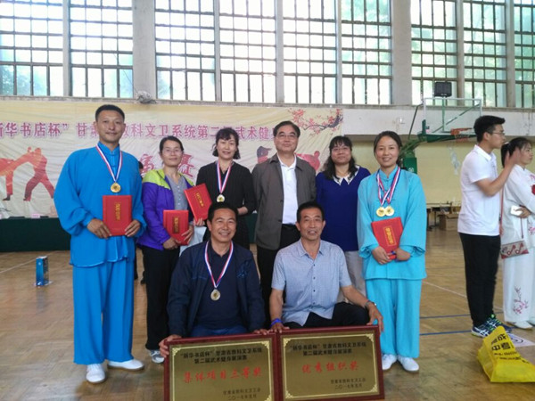 5月26日,由甘肃省教科文卫工会主办的“新华书店杯”甘肃省教科文卫系统第二届武术健身展演赛在兰州城市学院闭幕。共有来自全省的12支代表队近250余人参加了比赛。 在本次比赛中,我校获团体赛三等奖1项;在个人项目中,外国语学院教师安澜获得武当太极十三式第一名、武当太极剑第一名,体育部教师孟强获56式陈式太极拳第一名、42式竞赛太极剑第二名,图书馆教师陈晓枫获42式太极拳第二名。学校获 “优秀组织奖”。