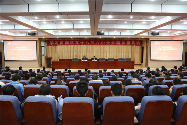贾宁希望全体师生认真学习贯彻十八届六中全会精神,一是将十八届六中全会精神同“两学一做”学习教育结合起来,提高自己的道德修养和理论素养,廉洁自律,做一名合格的共产党员;二是将十八届六中全会同全国高校思想政治工作会议精神结合起来,贯彻落实党的教育方针政策,坚持把立德树人作为中心环节,把思想政治工作贯穿教育教学全过程,实现全程育人、全方位育人。结合现代媒体和大学生特点,不断创新“两课”教育教学方式和方法;三是将十八届六中全会同自己的本职工作结合起来,严格遵守高等教育法,遵守师德师风的规定,在工作中敢于创新、敢于担当,努力在本职岗位上为学校发展,为学生成长成才做出积极贡献。