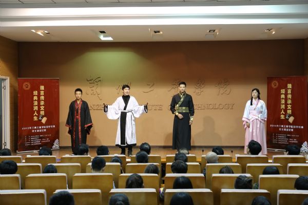 二是开展了经典诗文鉴赏活动。举办了“中华美文”诗歌朗诵和校园经典朗诵活动。青年学子积极阅读传统诗歌,在浩如烟海的传统文化中挑选喜爱的经典诗歌,将自己对诗词的理解和感悟用形体语言展现出来,精彩的节目、抑扬顿挫的情调和典雅古装的服饰,展现了经典古诗文的声韵和意蕴之美,充分发挥了青年学生的聪明才智和善于创新、思维活跃的特点。从经典中既感悟到了我国古典诗词的深邃意境和语言的魅力,也感悟到了诗词中蕴藏的丰富人生哲学和处事方式,增强了青年学子对我国古典诗词的热爱。