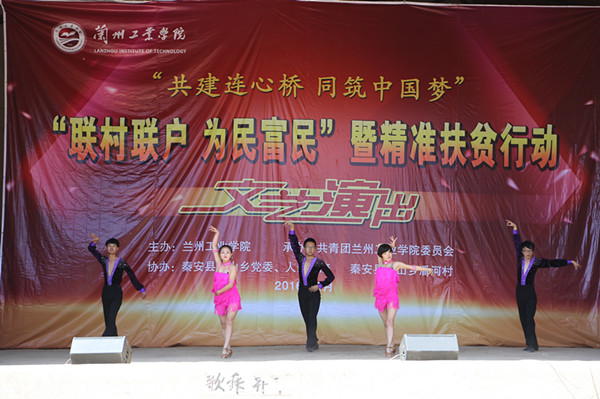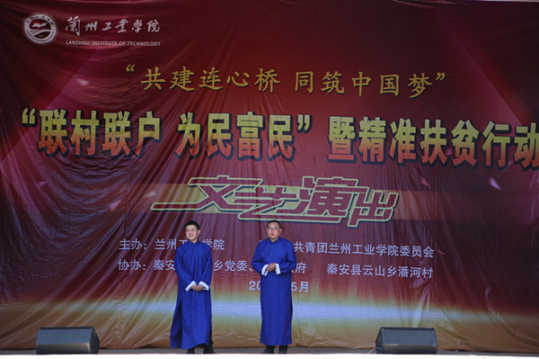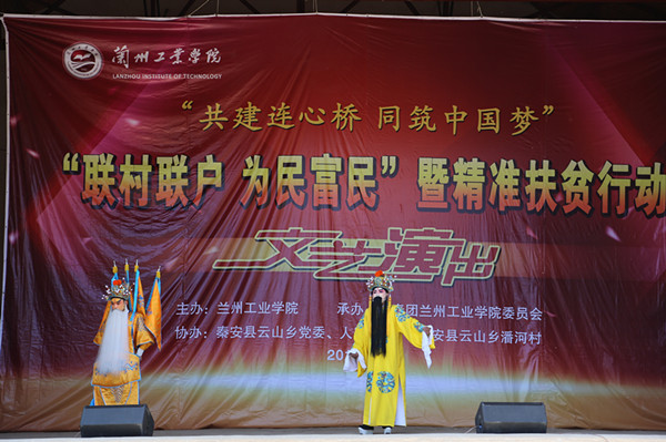 5月29日,副校长冯彪带领我校45名师生赴秦安县云山乡潘河村开展“双联”精准扶贫工作,举办“共建连心桥 同筑中国梦”主题文艺演出,检查我校在潘河村重点帮扶项目建设情况,看望我校驻潘河村干部。 文化下乡是校党委结合联系村与学校实际确定的重点帮扶内容之一,文艺演出是文化下乡活动的重要形式,每年在各联系村进行巡演。 参演教师和大学生艺术团、国学社的同学们为当地群众带去了器乐合奏、歌曲、朗诵、二胡、魔术、舞蹈、秦腔、武术表演等风格各异、形式多样的精彩节目。演出在《节日欢歌》中落下帷幕。潘河村及临近村的数百名学生、群众观看了演出。 冯彪在云山乡和乡党委书记王来生、乡长高锋座谈,就进一步做好“双联”和精准扶贫工作进行了交流。随后,在潘河村领导和学校双联办工作人员陪同下检查我校在潘河村的重点建设项目——“连心桥”建设情况,看望了我校在潘河村的驻村干部。