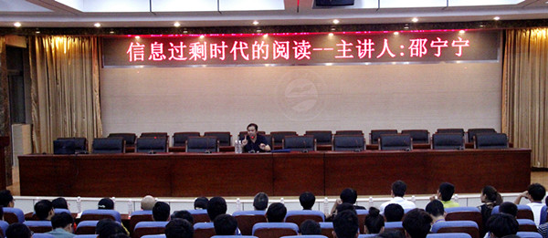 5月30日晚,工院人文讲坛第十二讲开讲。著名学者、批评家、博士生导师、海南师范大学文学院院长邵宁宁作题为《信息过剩时代的阅读》的专题讲座。全校师生400余人听取了讲座。 邵宁宁以时间为主线,讲述了信息发展的时代规律,启发我们该如何防止垃圾信息不经选择、未经允许地侵入,从而有选择地接受有价值的信息。他提出,在任何时代,读书、读经典是永远不会错的,只要选择了适合自己的经典著作就是好的。经典著作之所以经典,是因为它经受了历史的考验与筛选,其价值被人们认可,才流传下来的。信息过剩的时代,摒弃垃圾信息,拒绝文化快餐,做高效读者,阅读经典,提升自我价值,是青年学子最正确的选择。(供稿、摄影/团委)