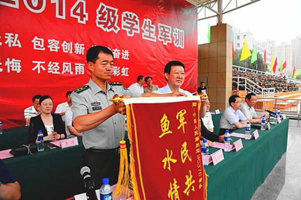 典礼上,校党委书记高永新向承训部队赠送了锦旗,芦天得中校宣读了《关于表彰2014级学生军训“先进集体”、“优秀学员”的决定》。