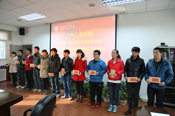 1月3日下午,2013年兰州市城关区就业服务局爱心捐助行动发放仪式暨就业援助服务工作座谈会在我校举行。兰州市城关区就业服务局局长张晓蓉、副局长侯舜元,甘肃青云建设有限公司党委书记刘伯铭、甘肃天奥珠宝黄金有限公司行政人事部经理芦玉君,学校副校长俞子泓出席座谈会,学生处、招就处等部门负责人,电气工程、土木工程、材料工程、汽车工程学院党总支书记及受助学生参加了会议。