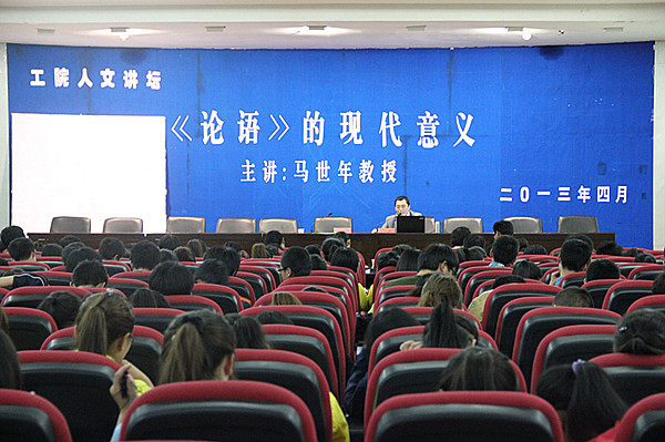 为进一步提高全校师生的人文素质,弘扬中华优秀传统文化,创建系列化、制度化、主题鲜明、富有时代特征的高品位校园文化,4月24日晚7:30,“工院人文讲坛”第一讲在八楼会议中心开讲。西北师范大学文学院副院长马世年教授应邀作了题为《< 论语>及其现代意义》的学术讲座,近500名师生聆听了讲座。