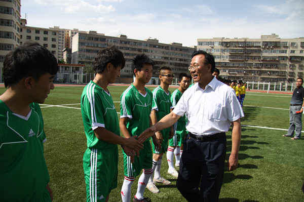 党委书记、院长陈彪为新建的草坪足球场首场足球赛开球