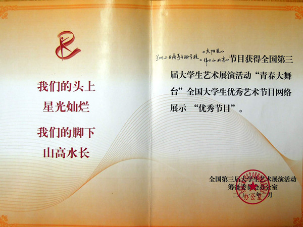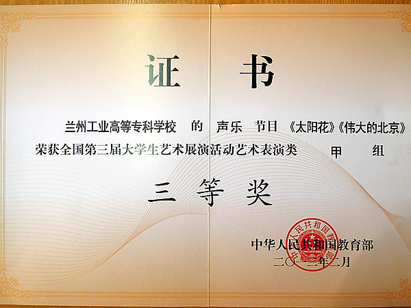 全国第三届大学生艺术展演活动近期落下帷幕。我院选送的作品合唱《太阳花》、《伟大的北京》荣获全国第三届大学生艺术展演活动艺术表演类甲组(非专业组)三等奖、“青春大舞台”全国大学生优秀艺术节目网络展示“优秀节目”,舞蹈《我的哈达铺》获得甘肃省第三届大学生艺术展演活动三等奖。