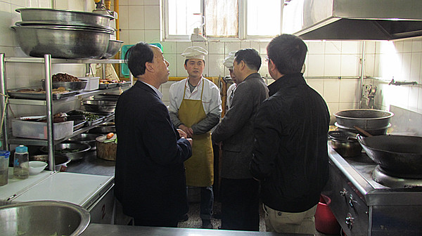 4月13日下午,王华栋带领后勤各部门负责人对南、北校区的校园环境、学生公寓、学生食堂及建筑工地等场所的卫生状况进行了检查。