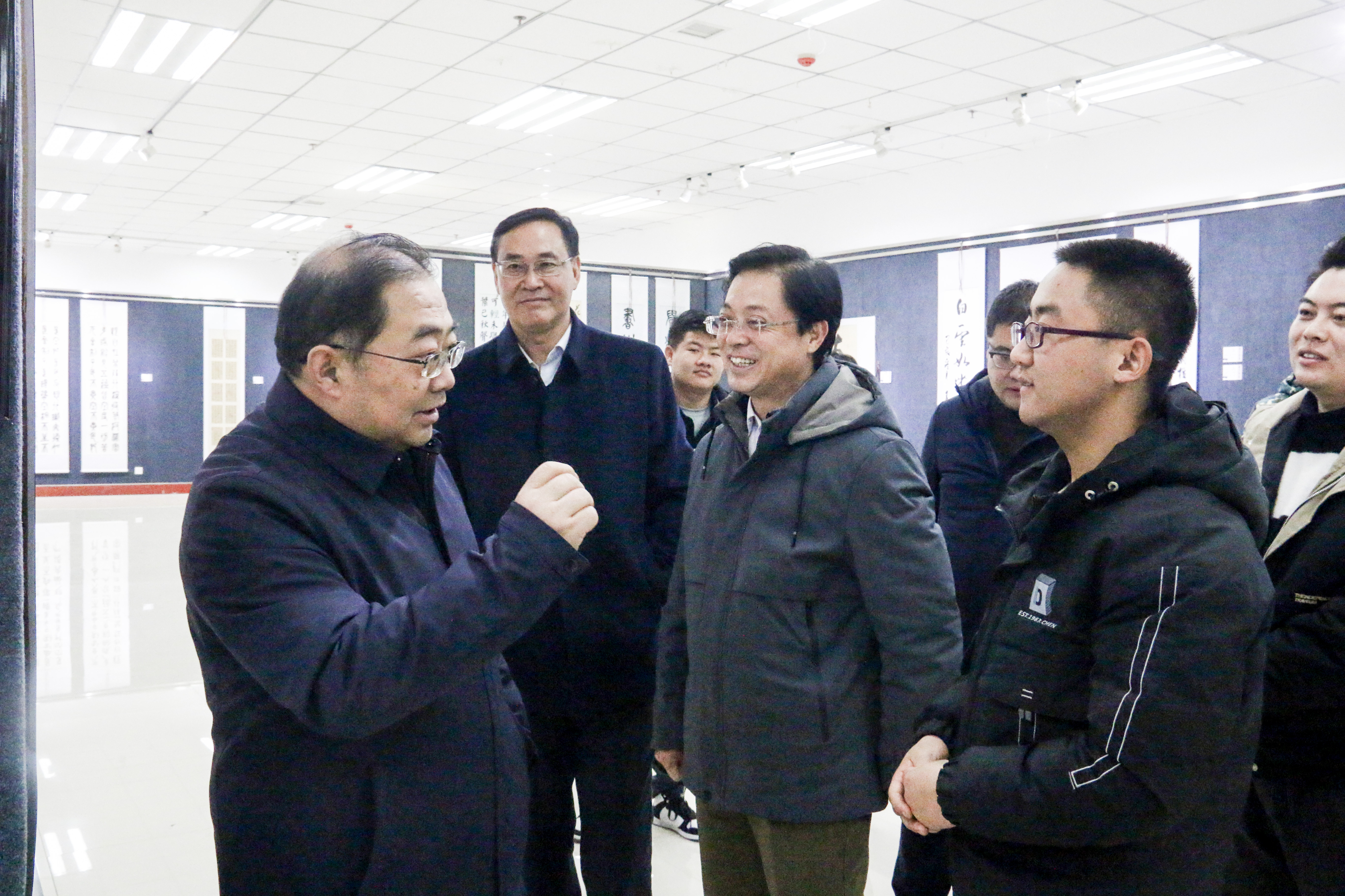 12月16日,由图书馆、校团委联合举办的“翰墨情缘”——李鹏飞、王双喜、黄文龙书法习作汇报展在图书馆展厅开展。党委书记俞子泓、党委副书记黄荟铭、校长助理雷在福,图书馆、团委负责人以及劲草书画协会全体成员和校内部分书法爱好者参观展览。
