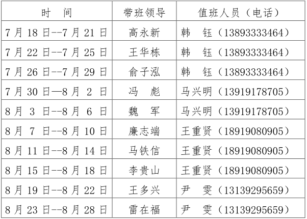 各值班人员在值班期间必须坚守岗位,认真履行职责,确保暑假期间各项工作的正常运转。