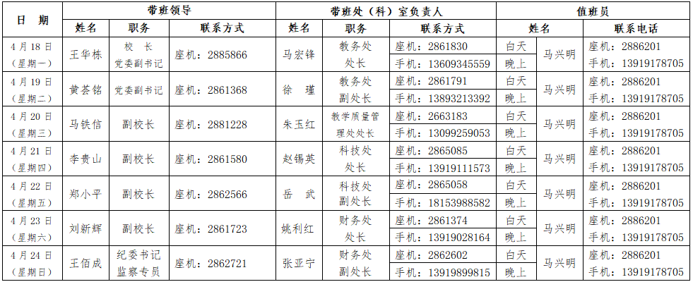注:带班领导、值班员必须24小时驻守值班,带班处(科)室负责人落实在岗带班制度,负责协调、处理各种突发、应急事件,坚决杜绝在家待班。