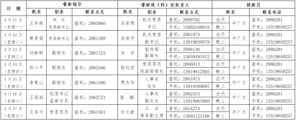 兰州工业学院4月份值班安排表
