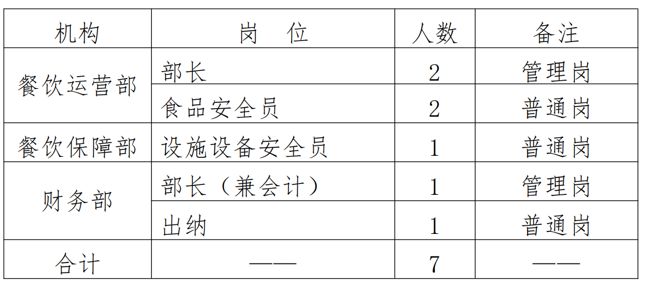 (一)餐饮运营部。部长、食品安全员均具有从事应聘岗位工作三年以上经历,具有大学专科及以上学历,具有一定写作能力,能熟练运用word、excel等办公软件;热爱并熟悉餐饮管理工作,食品安全意识和防患意识强,工作执行力和责任心强;能认真履行工作职责,工作有想法,有思路,有方法,沟通能力较强;认真坚守岗位,热爱餐饮工作,甘于奉献,不计得失。食品安全员兼库房管理员工作职责。