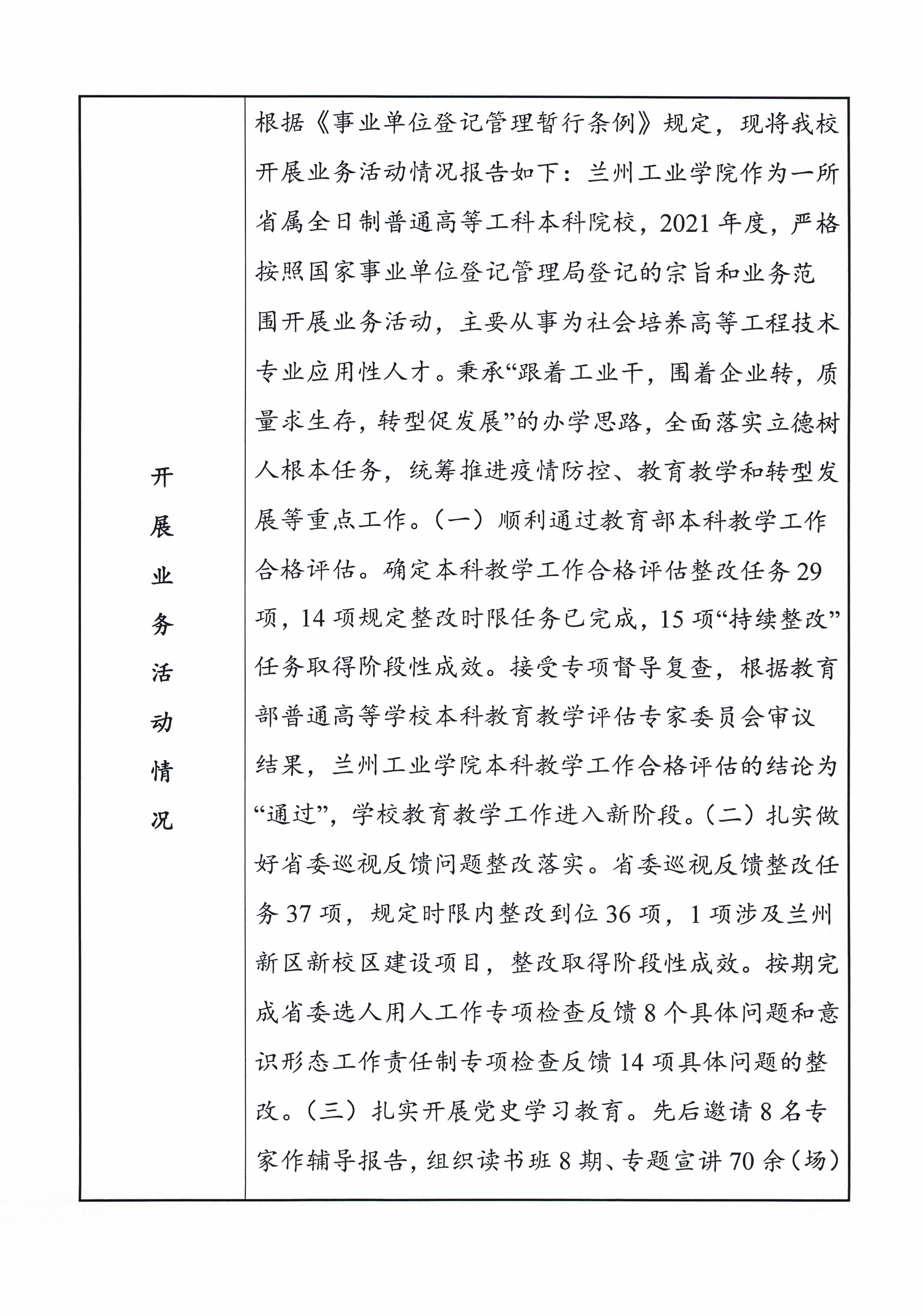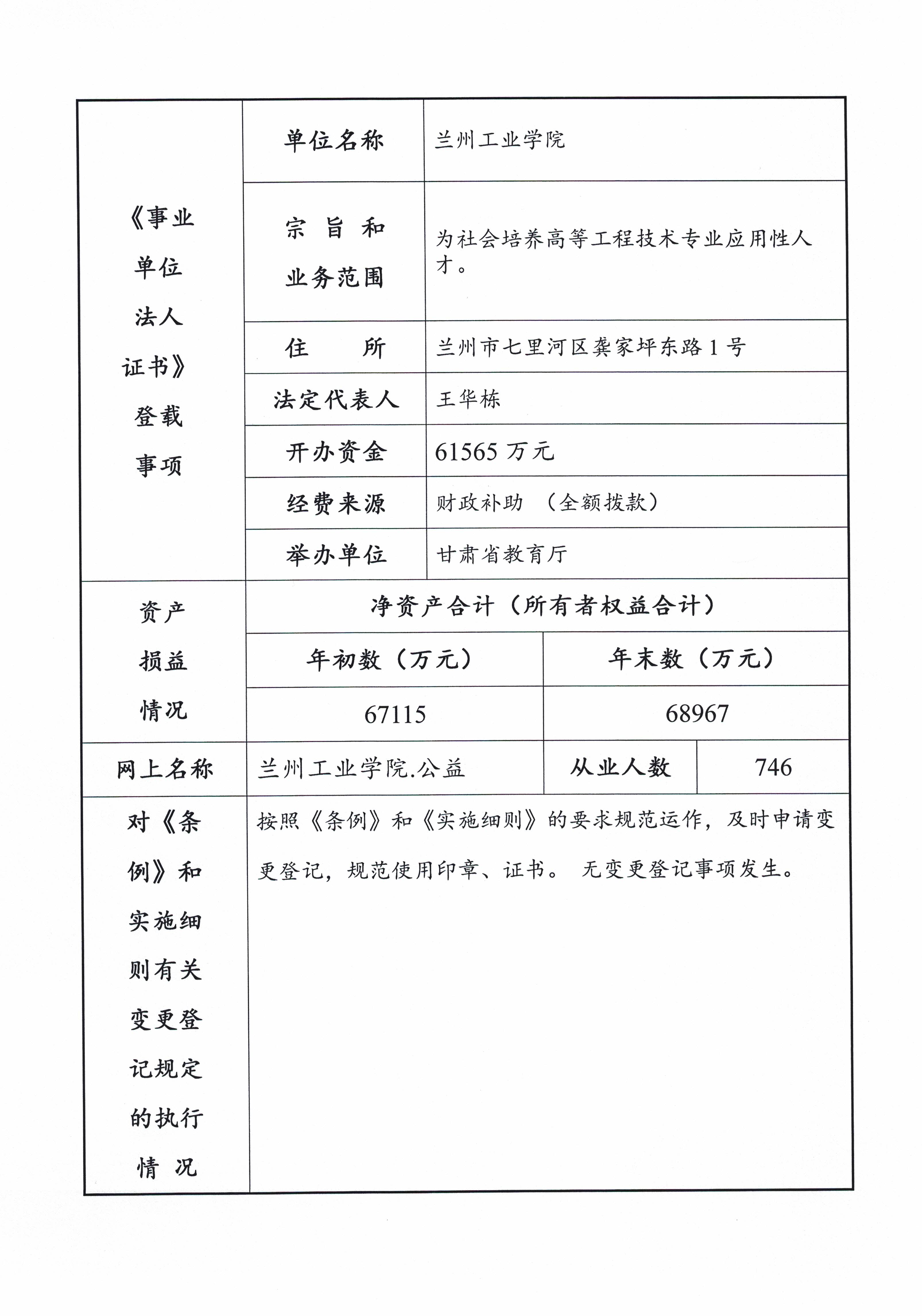 现将兰州工业学院《事业单位法人年度报告书》予以公示,如有不实,请以书面形式向省教育厅人事处反映。
