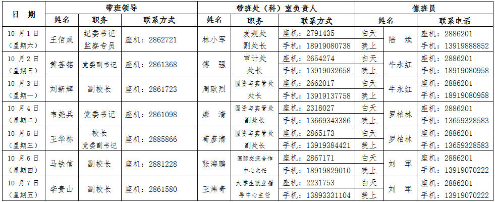 注:带班领导、值班员必须24小时驻守值班,带班处(科)室负责人落实在岗带班制度,负责协调、处理各种突发、应急事件,坚决杜绝在家待班。