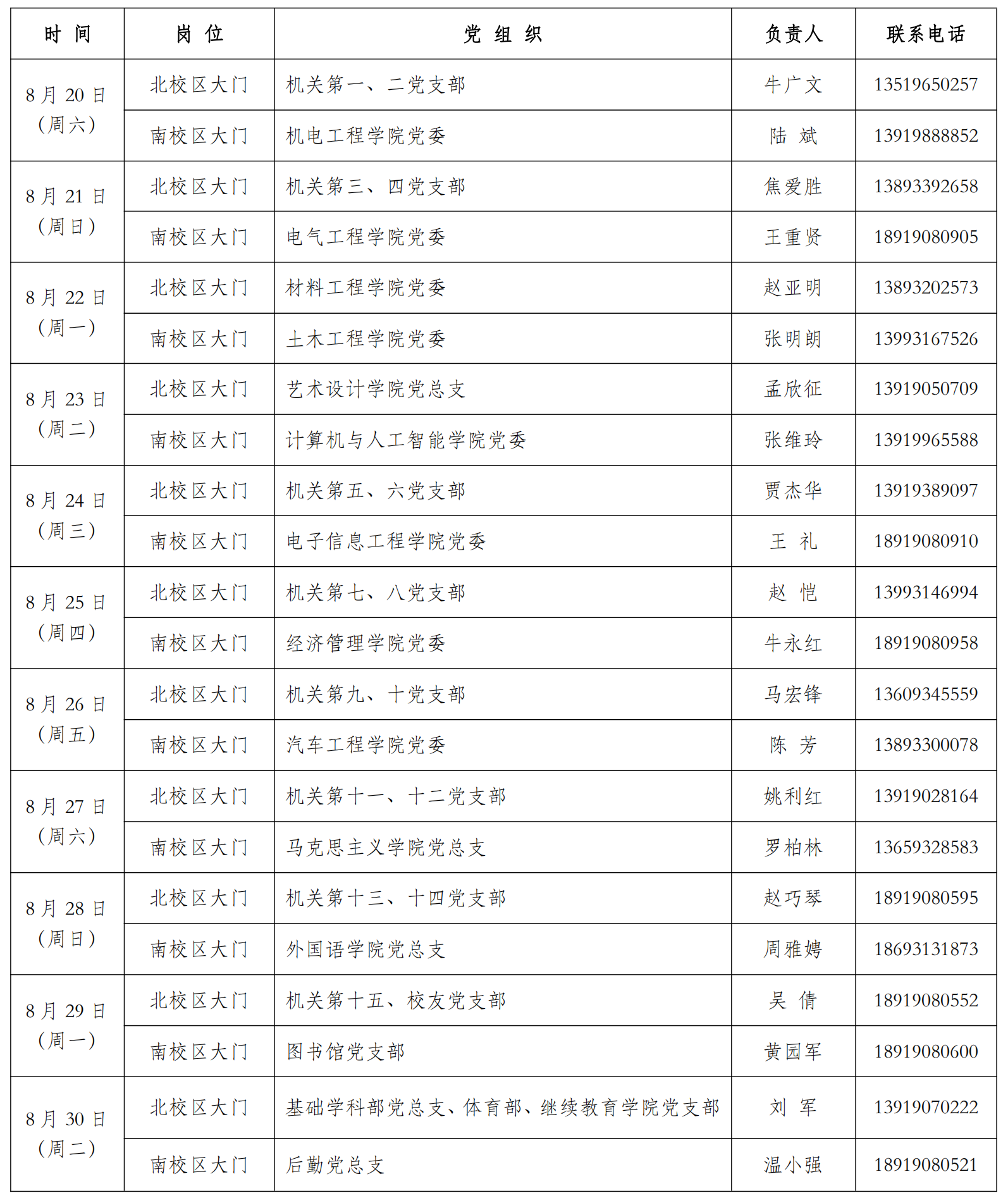 根据《新型冠状病毒肺炎防控方案(第九版)》《高等学校新冠肺炎疫情防控技术方案(第五版)》《甘肃省强化常态化核酸检测及查验的实施方案》精神,按照省教育厅《关于统筹做好2022年秋季学期高校开学和疫情防控工作的通知》要求,结合学校疫情防控办第34号公告,自8月20日起,8月20日(星期六)---8月30(星期二),校园实行封闭管理,师生员工进校后不得出校。为确保封闭期间学校疫情防控工作和教学秩序运行平稳有序,设立“党员先锋岗”,现做出如下安排:
