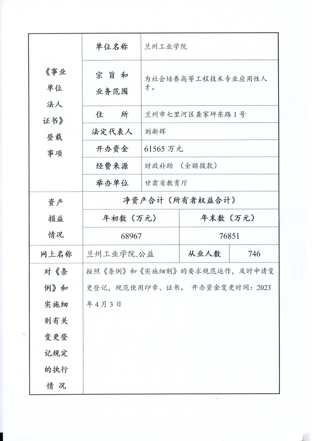 现将兰州工业学院《事业单位法人年度报告书》予以公示,如有不实,请以书面形式向省教育厅人事处反映。