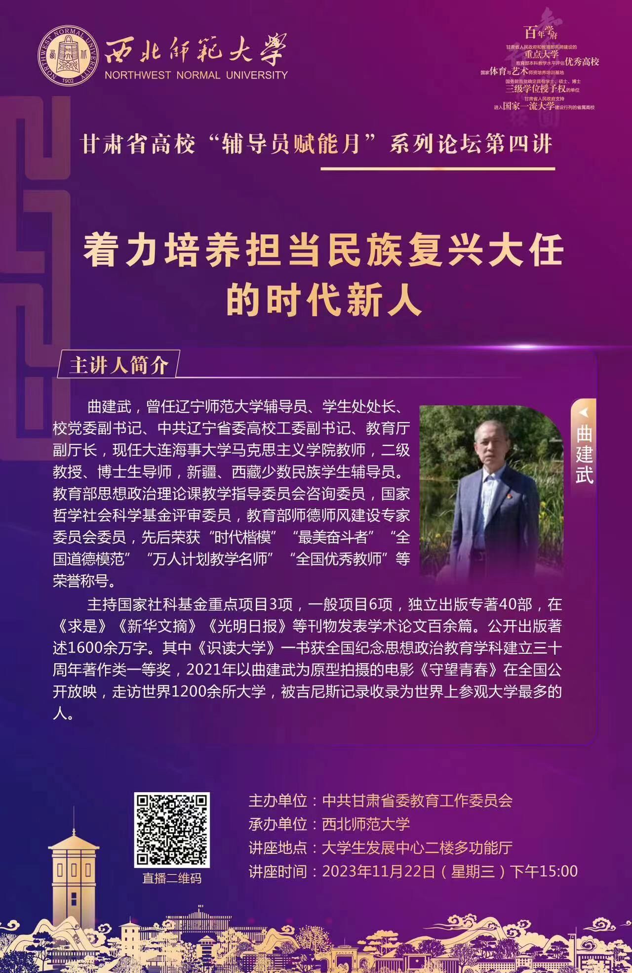 为进一步提升辅导员的职业素养,营造培养担当民族复兴大任时代新人的良好氛围,特组织辅导员、班主任聆听著名学者曲建武教授专题讲座,现将活动安排通知如下: