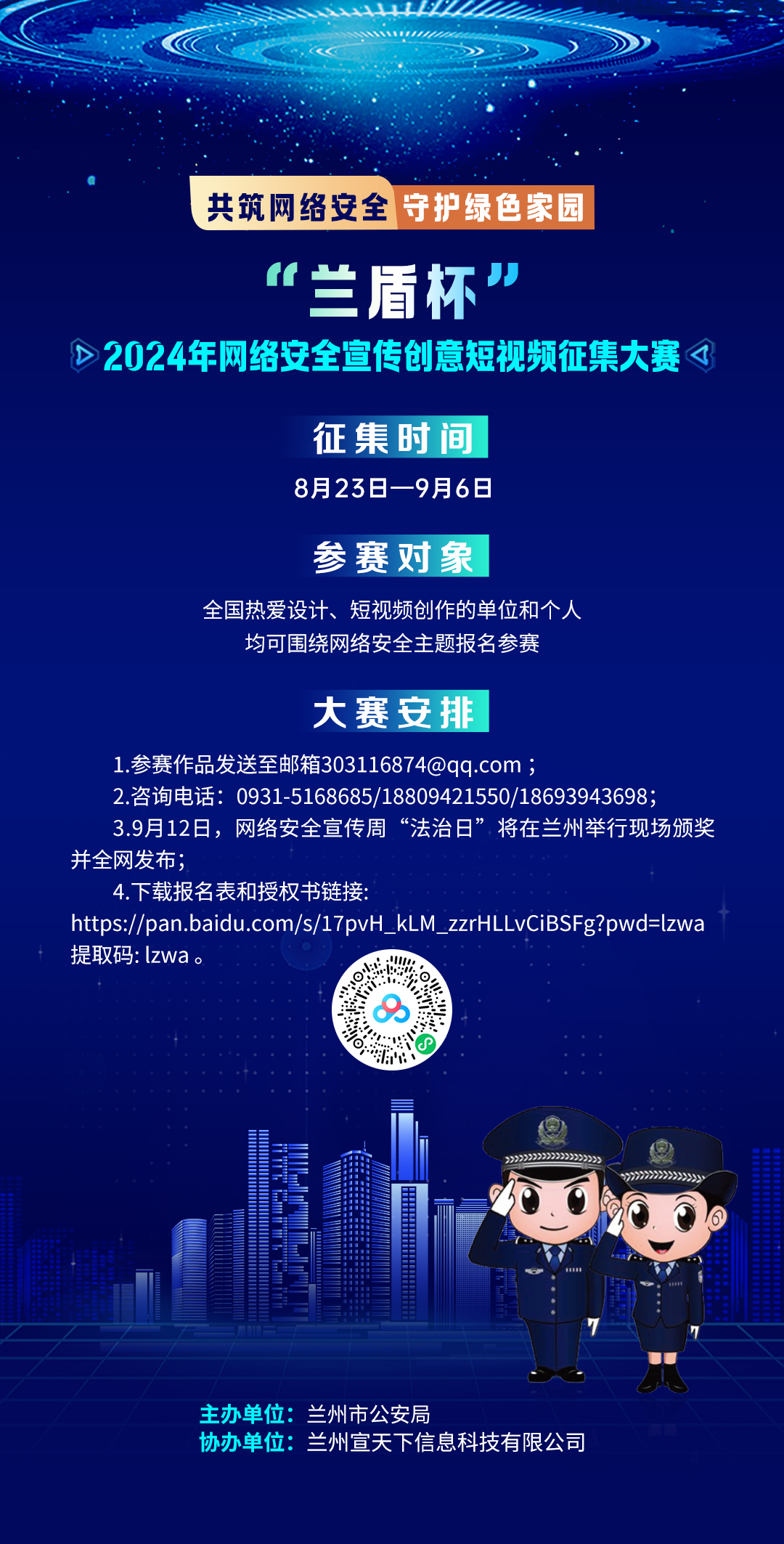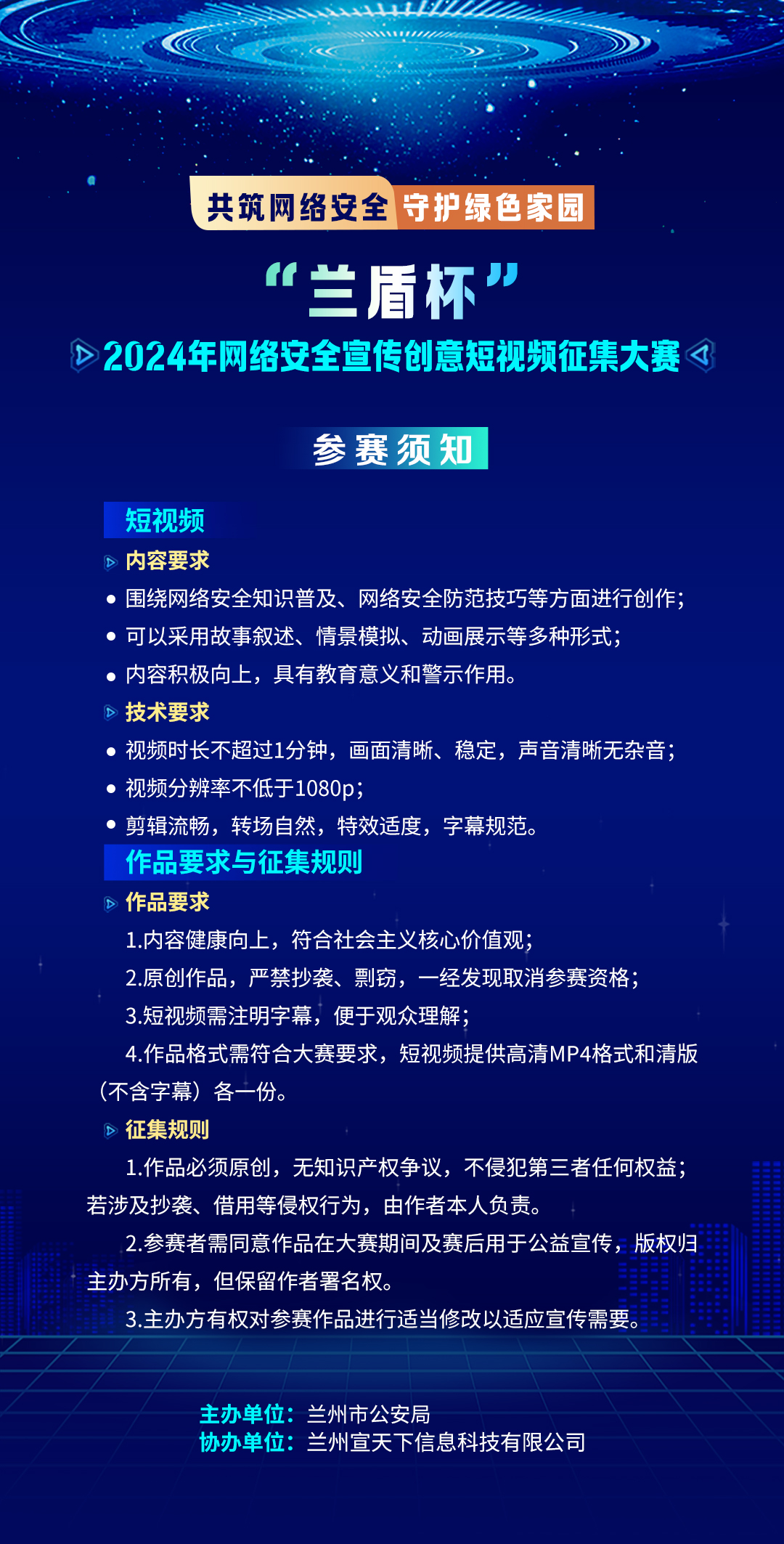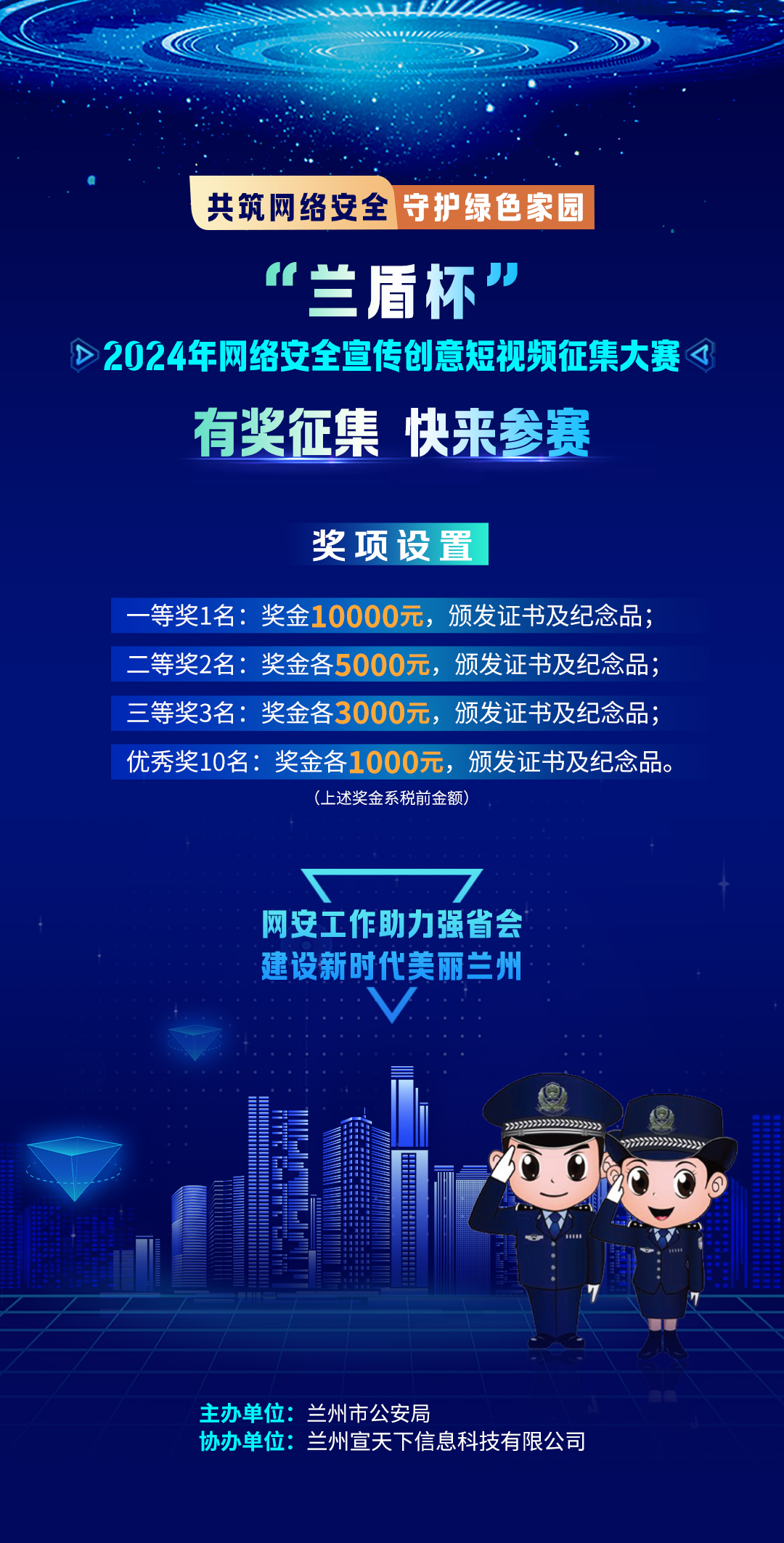 为全面提高我校学生创新意识,锻炼其创意思维,进一步促进学生网络安全意识,提高学生网络安全知识与实践能力,特邀请全校热爱设计、短视频创作的单位或个人,参加由兰州市公安局主办的“兰盾杯”2024年网络安全宣传创意短视频征集大赛。现将大赛相关事宜图片通知如下: