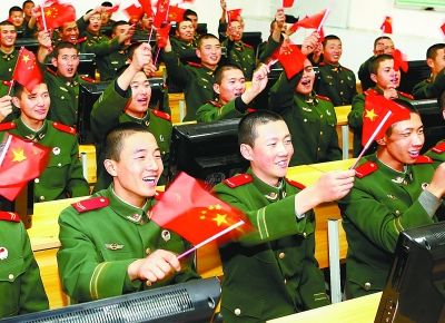 11月12日,武警甘肃总队兰州支队九中队官兵在学习室收听收看十八届三中全会公报。记者 张子恒