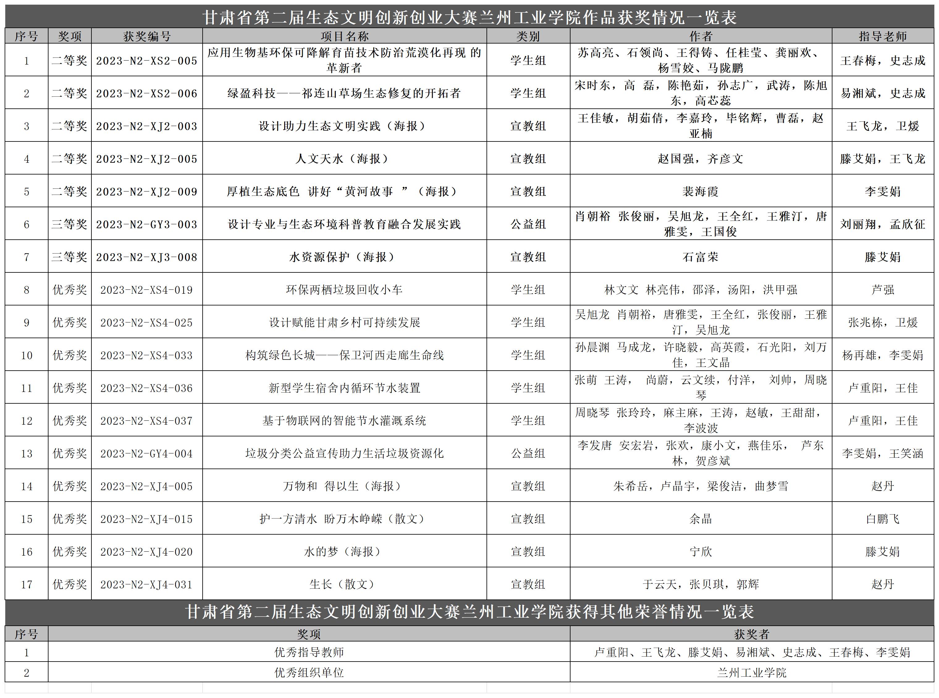 近日,第二届甘肃省青年生态文明创新创业大赛圆满落幕,团省委、省教育厅、省人力资源和社会保障厅、省生态环境厅、省自然资源厅等部门联合发文公布关于第二届甘肃省青年生态文明创新创业大赛获奖名单的通告。我校共推荐74项校赛优秀项目(作品)参加省级决赛,经过激烈角逐,我校师生荣获各类奖项25项,其中17件作品获学生组二等奖2项,优秀奖5项;公益组三等奖1项,优秀奖1项;宣教组二等奖3项,三等奖1项,优秀奖5项。卢重阳、王飞龙、滕艾娟、易湘斌、史志成、王春梅、李雯娟7位教师获“优秀指导教师”称号,学校获“优秀组织单位”称号。