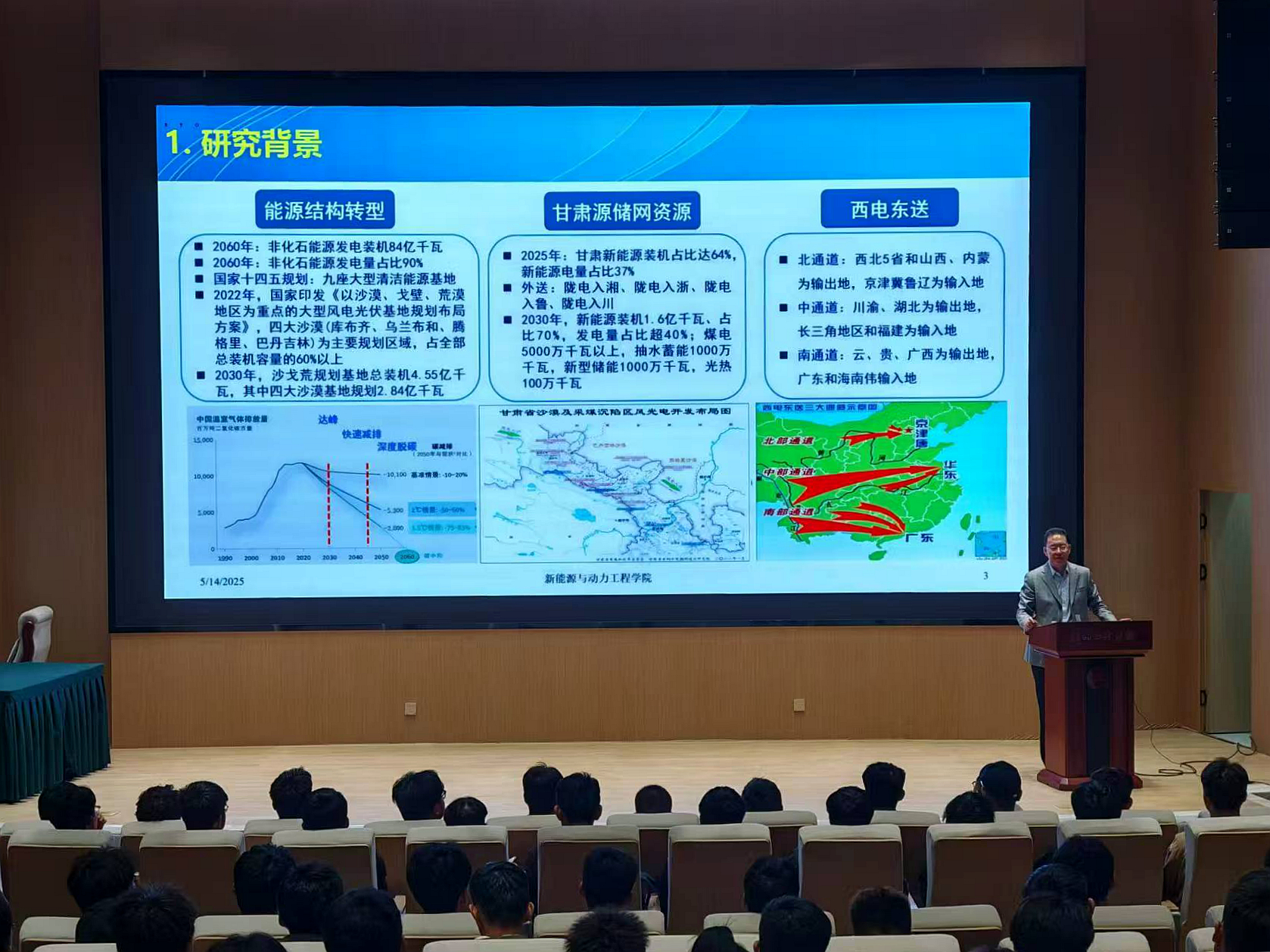 5月14日下午,兰州交通大学新能源与动力工程学院董海鹰教授应邀来校作题为《基于综合效益的沙戈荒大型新能源发电基地规划技术》的学术报告。