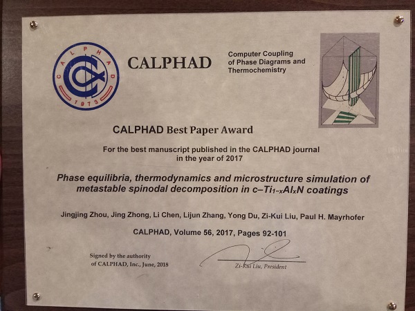 2018年5月31日,在墨西哥克雷塔罗州举办的第47届相图及热化学计算耦合国际会议(CALPHAD XLVII)公布了2017年度《CALPHAD》最佳论文奖,我校材料工程学院周晶晶博士发表的题为“Phase equiliria, thermodynamics and microstructure simulation of metastable spinodal decomposition in c-Ti1-xAlxN coatings”的学术论文荣获该奖项,并获1000美元奖金。