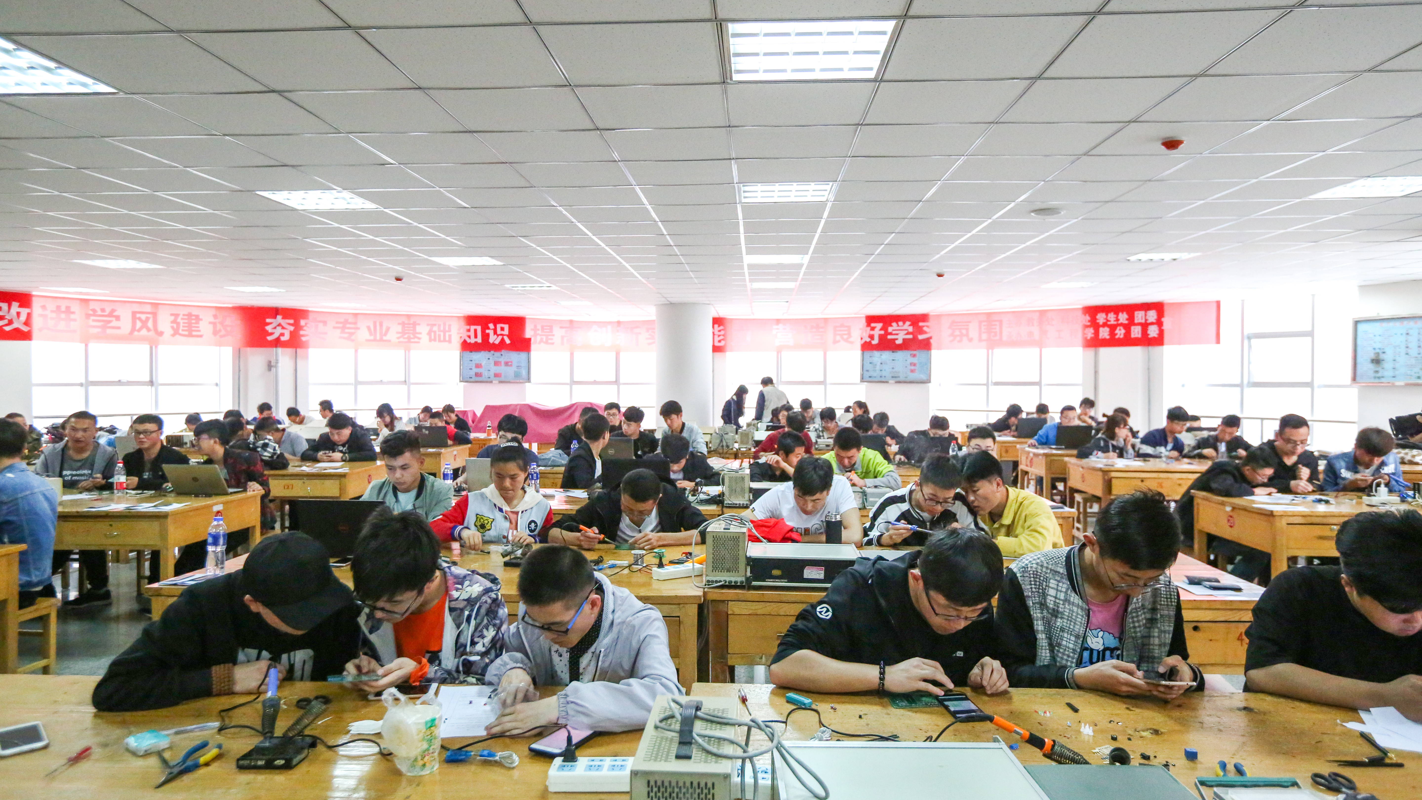 本次大赛以“走进电子世界,引领时代科技,创新精彩生活”为主题,共有来自4个学院的32个参赛队96名学生参赛。竞赛内容包括“实际制作”和“设计开发”两部分,每个参赛队在规定的时间内完成了所选题目的设计、调试、质量检测及作品功能说明书编写等内容。评审专家从制作过程、终端产品及功能等方面对每个参赛队的竞赛结果进行了综合评价。最终,电气工程学院“天翊队”和“山之队”获一等奖;机电工程学院“飞跃队”,电子信息工程学院“Master云创”队和电气工程学院“梦之队”获二等奖;电子信息工程学院“勇凯队”,电气工程学院“启梦”队、“三人行”队、“凌云战队”和汽车工程学院的“ABS队”获三等奖。