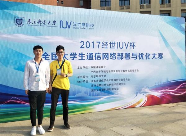 11月8日至10日,由中国通信学会、全国高等学校电子信息类专业教学指导委员会联合主办的全国2017“经世IUV杯”通信网络部署与优化设计大赛在南京邮电大学举办。来自全国18个省、市的30支代表队参加了大赛。经过紧张激烈的角逐,我校电子信息工程学院电信15班学生牛一童、宋子龙组成的代表队荣获优秀奖。