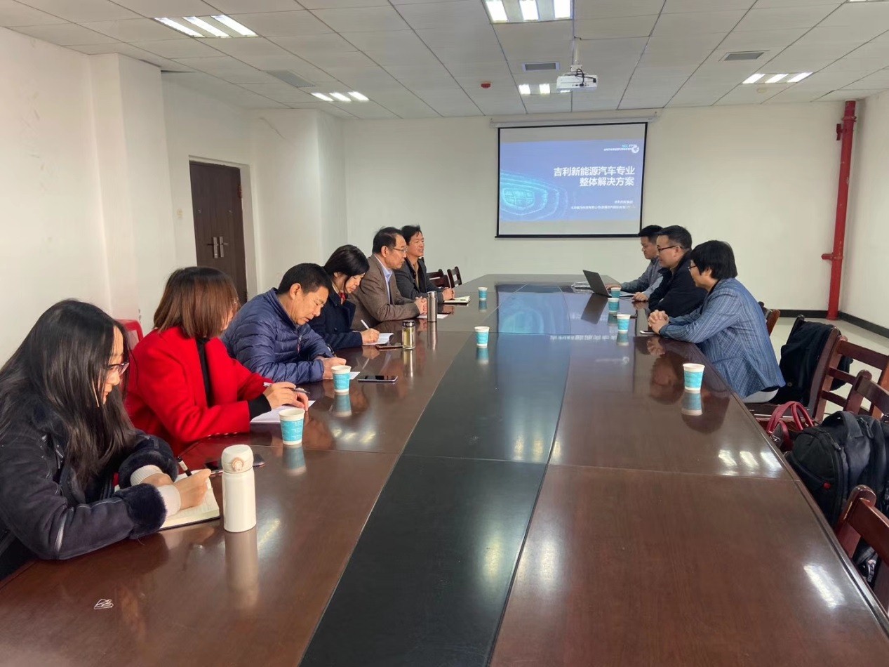 调研中,吉利国际教育集团副总裁戴盛中介绍了吉利集团概况以及与学校共建汽车智能网联的方案。李贵山详细介绍了我校办学历史、基本情况、专业建设、人才培养等,并围绕产教融合作了深入交流。双方希望在新能源汽车、智能网联等领域开展良好的合作。