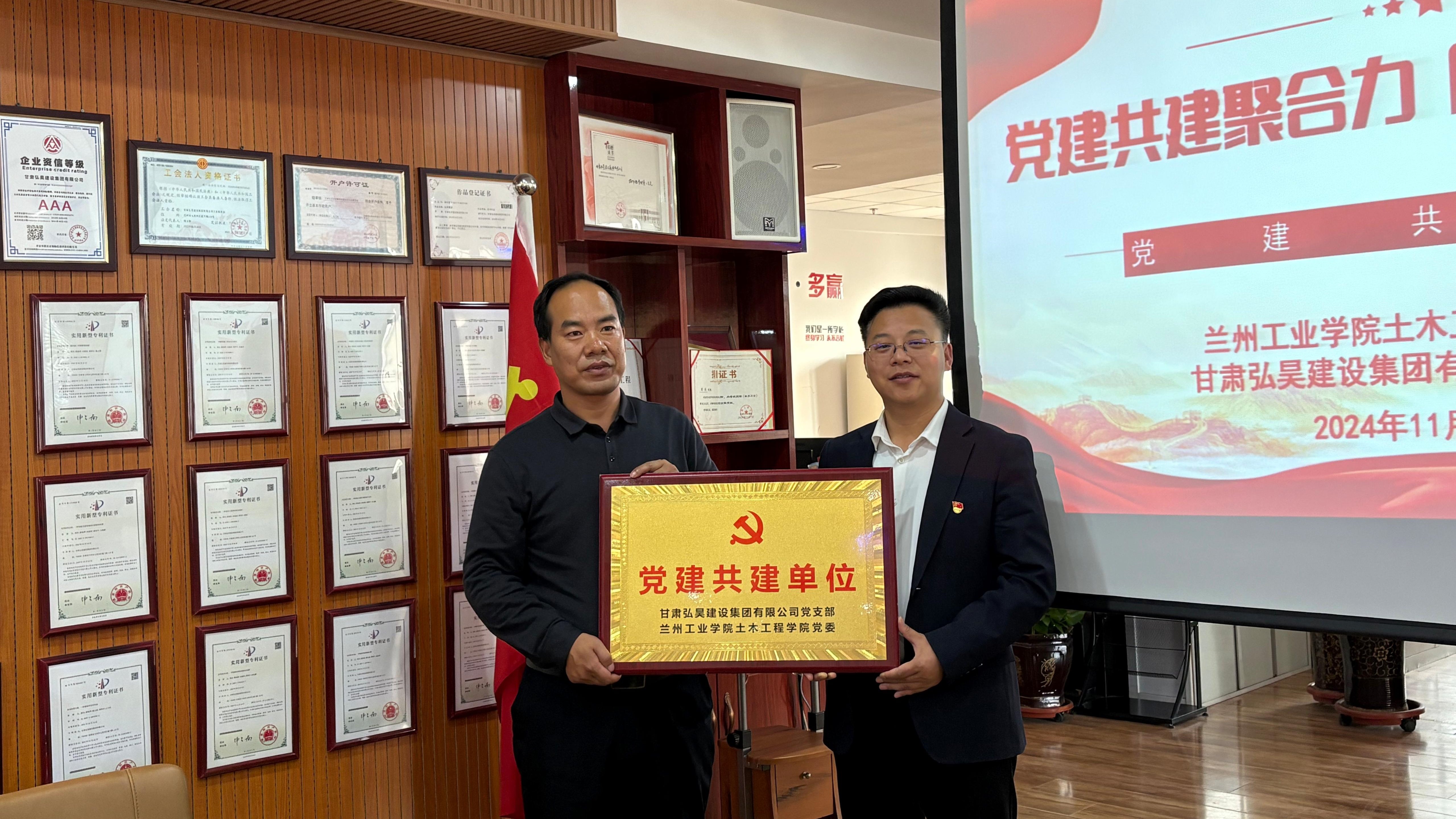 甘肃弘昊建设集团有限公司总经理周杰对企业创办历程、公司业绩、经营规模、企业文化及党建工作经验等方面作了交流分享,并表示将以此次党建共建活动为契机,充分发挥党建引领作用,共谋校企高质量一体化发展,共同打造校企合作新典范,通过开展联合主题党日、党员教育培训等活动,搭建双方党支部互学互促的交流平台。