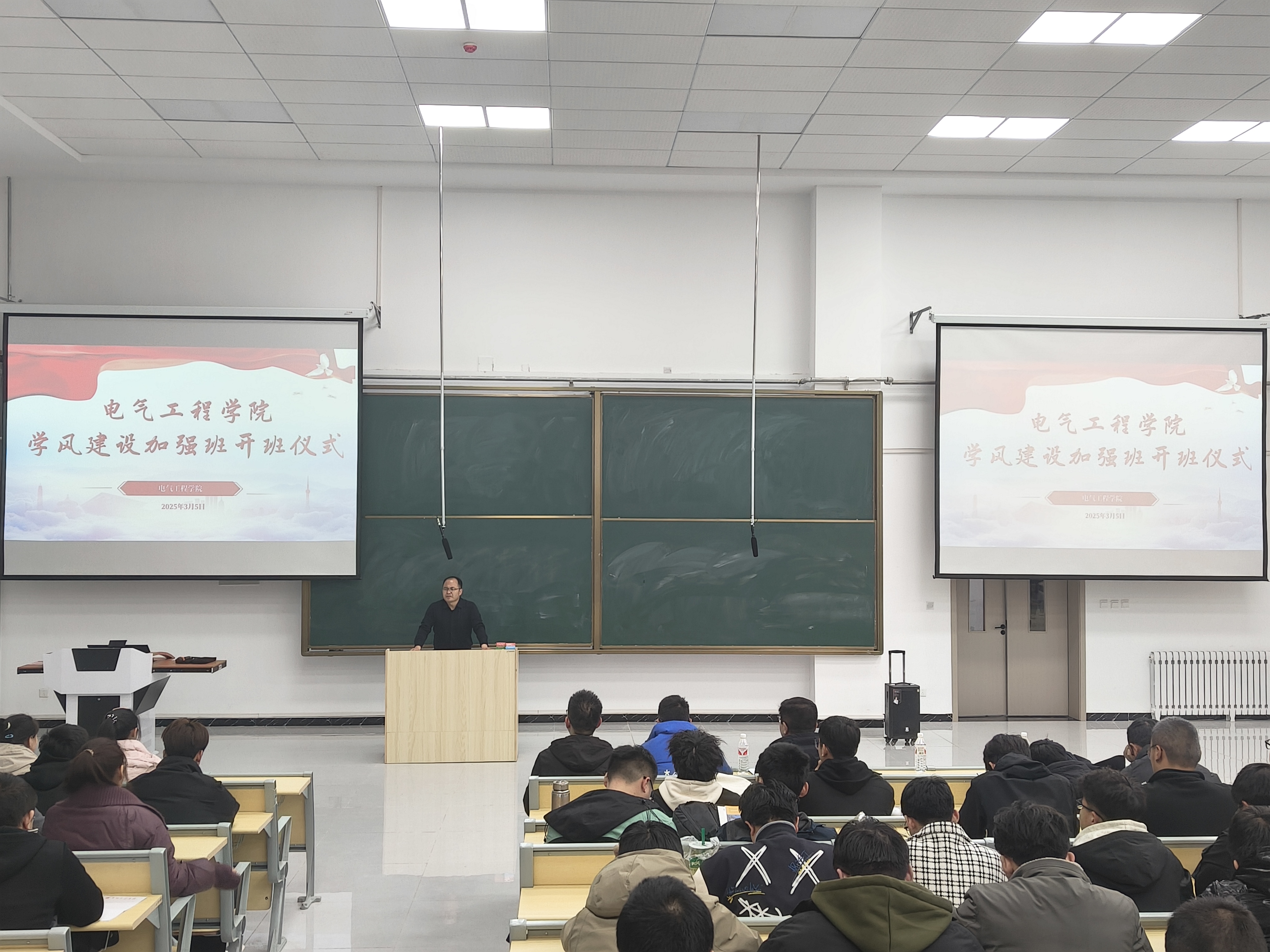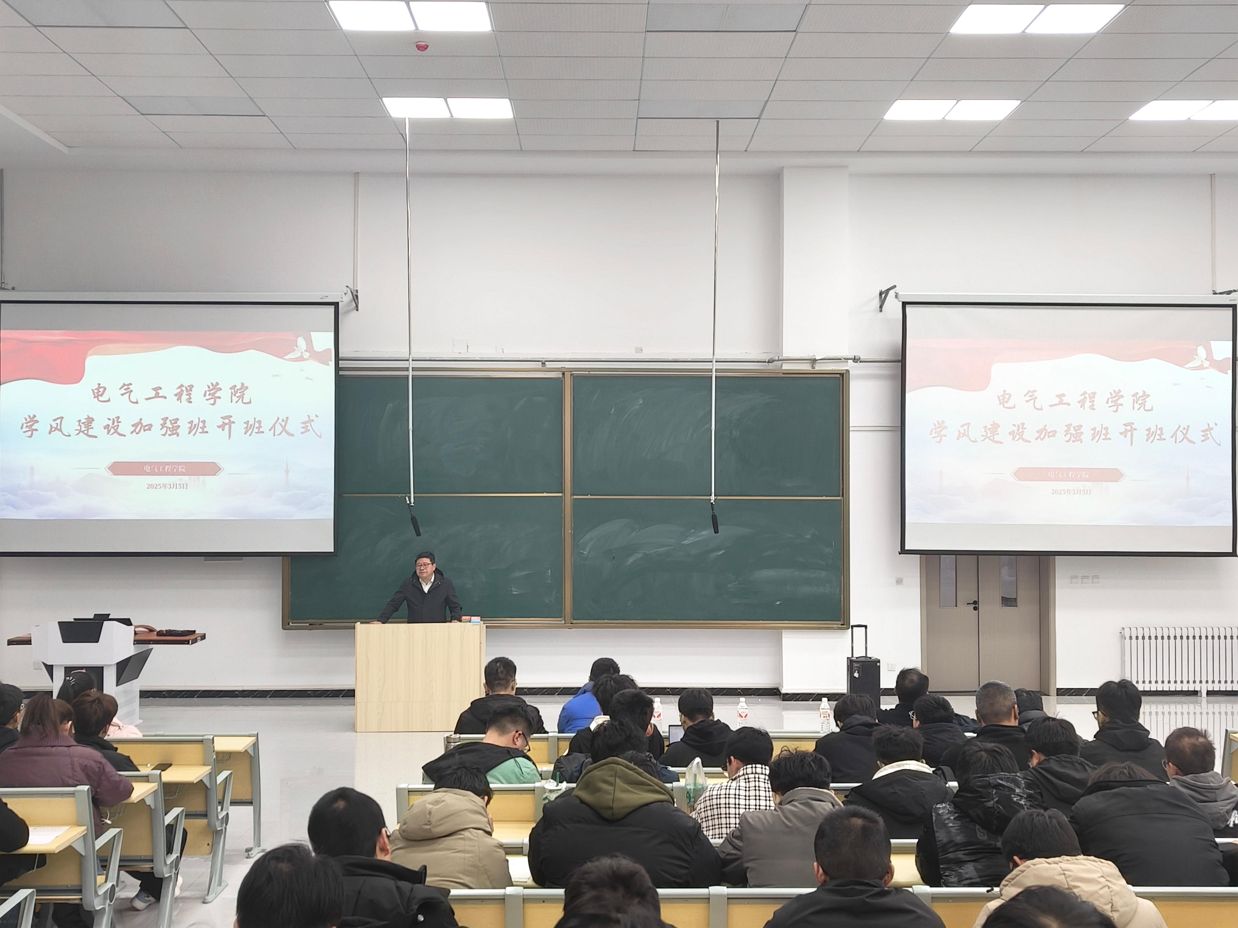 为深入贯彻党的二十届三中全会精神,全面落实立德树人的根本任务,进一步加强学院学风建设,营造严谨治学、奋发向上的学习氛围,3月5日晚,电气工程学院在公共教学楼E103举行“学风建设加强班”开班仪式。党委学工部部长高爱民、电气工程学院党委书记王重贤参加仪式。