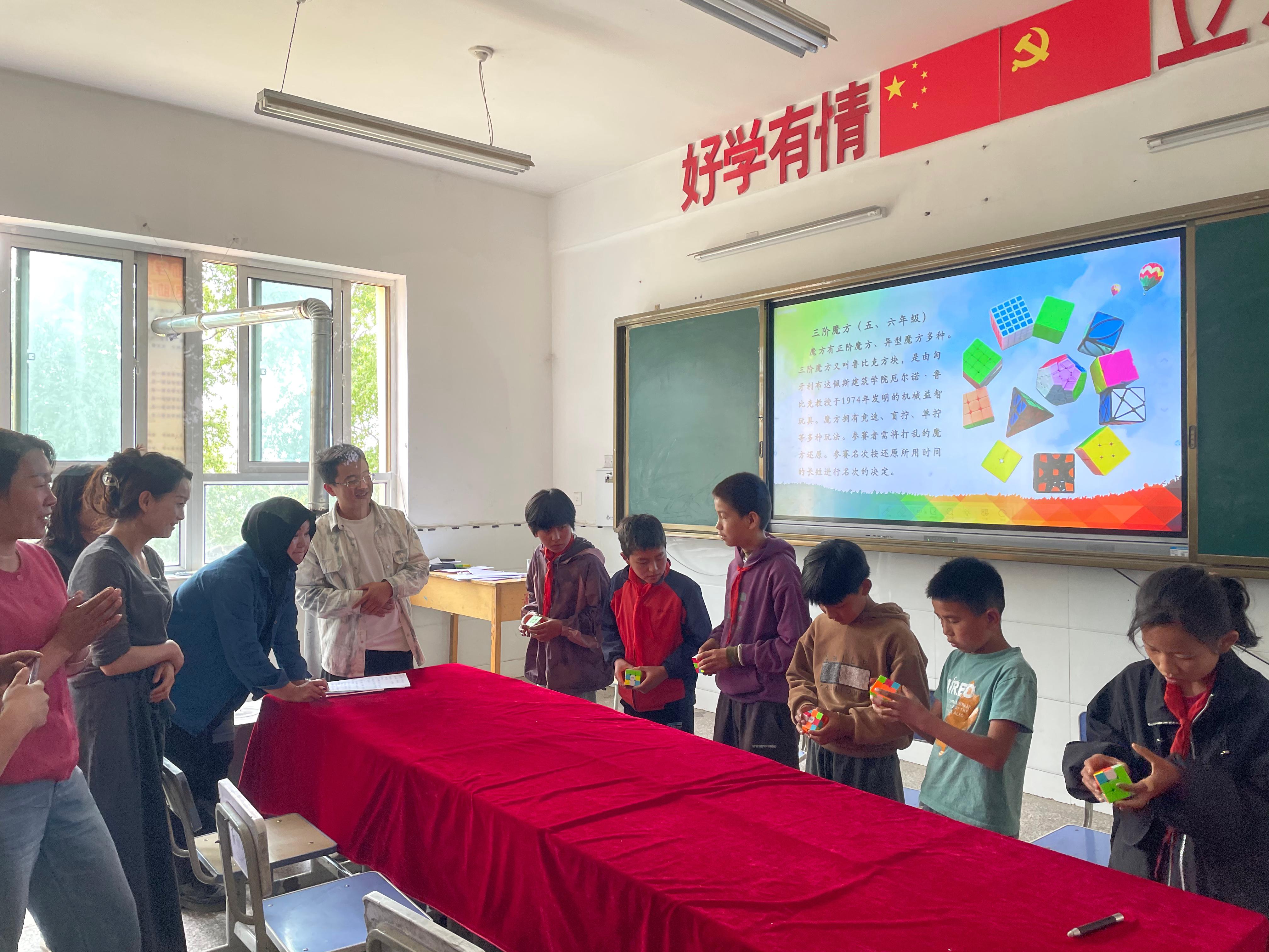 “探数学之趣,启思维之智”数学文化节是我校为提升民族地区学生数学素养与创新思维,激发学生数学兴趣而开展的趣味数学节活动。本次活动根据儿童的认知特点,设置了七巧板拼图、三国华容道、三阶魔方还原、口算、速算24点、数独填空6项活动。活动从4月份开始,首先在全校范围内进行了培训和选拔,最终有36名同学胜出并参加决赛。