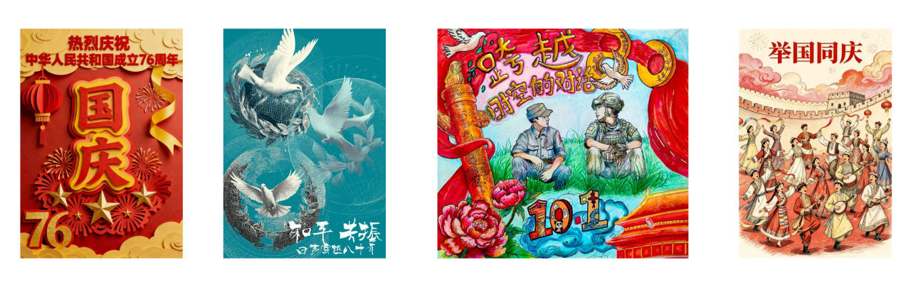 本次展览自征稿以来,共收到200余件来自不同专业、不同年级的手绘与创意设计作品,每一件作品都是师生们对祖国繁荣昌盛的美好祝愿和对美好生活的向往。作品紧扣“铭记历史”与“祝福祖国”两大主题,或聚焦抗战历史中的英雄事迹与峥嵘岁月,或展现新中国成立76年来的辉煌成就与山河锦绣,或描绘新时代青年对和平的守望、对民族复兴的憧憬。既展示了师生们扎实的专业技能,更体现了艺术设计学院学子深厚的历史素养与强烈的时代责任感,从不同角度诠释了青年学子对历史的敬畏、对和平的珍视、对祖国的深情。