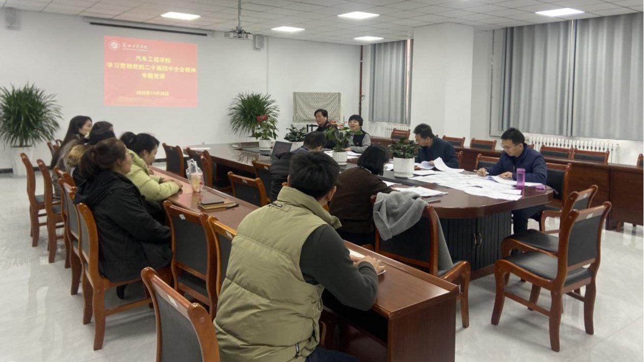11月28日下午,汽车工程学院党委在学院会议室组织开展学习贯彻党的二十届四中全会精神专题党课暨党外知识分子座谈会。学院党政领导班子成员、全体教职工党员及党外知识分子教师参加会议。